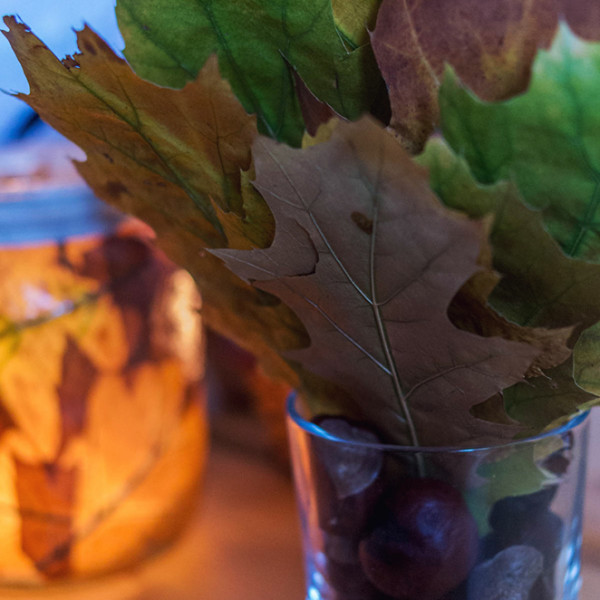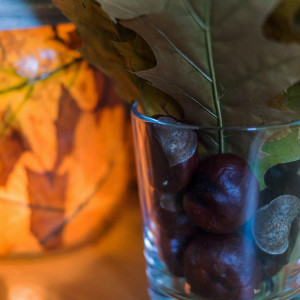 Останалите листа просто подредих в една чаша с кестени и … си имам есенно ъгълче, което ще ме радва докато извадя коледната украса.